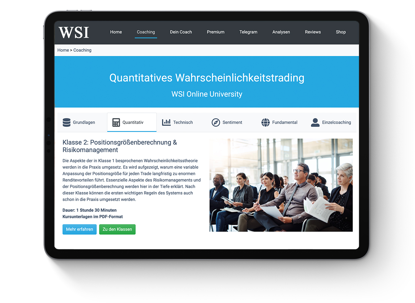 Langfristig profitables Trading kann mit der Wahrscheinlichkeitstheorie der Wall Street Banken erklärt werden. Wall Street Trader Michael führt Euch Schritt für Schritt an diese erfolgsbringende Theorie heran und untermauert zugehörige Konzepte mit praktischen Beispielen. Weiterhin werden mögliche zukünftige Kapitalentwicklungen zusammen berechnet. Ehemalige Absolventen bezeichnen diese Klasse oft als „wahren Augenöffner“.