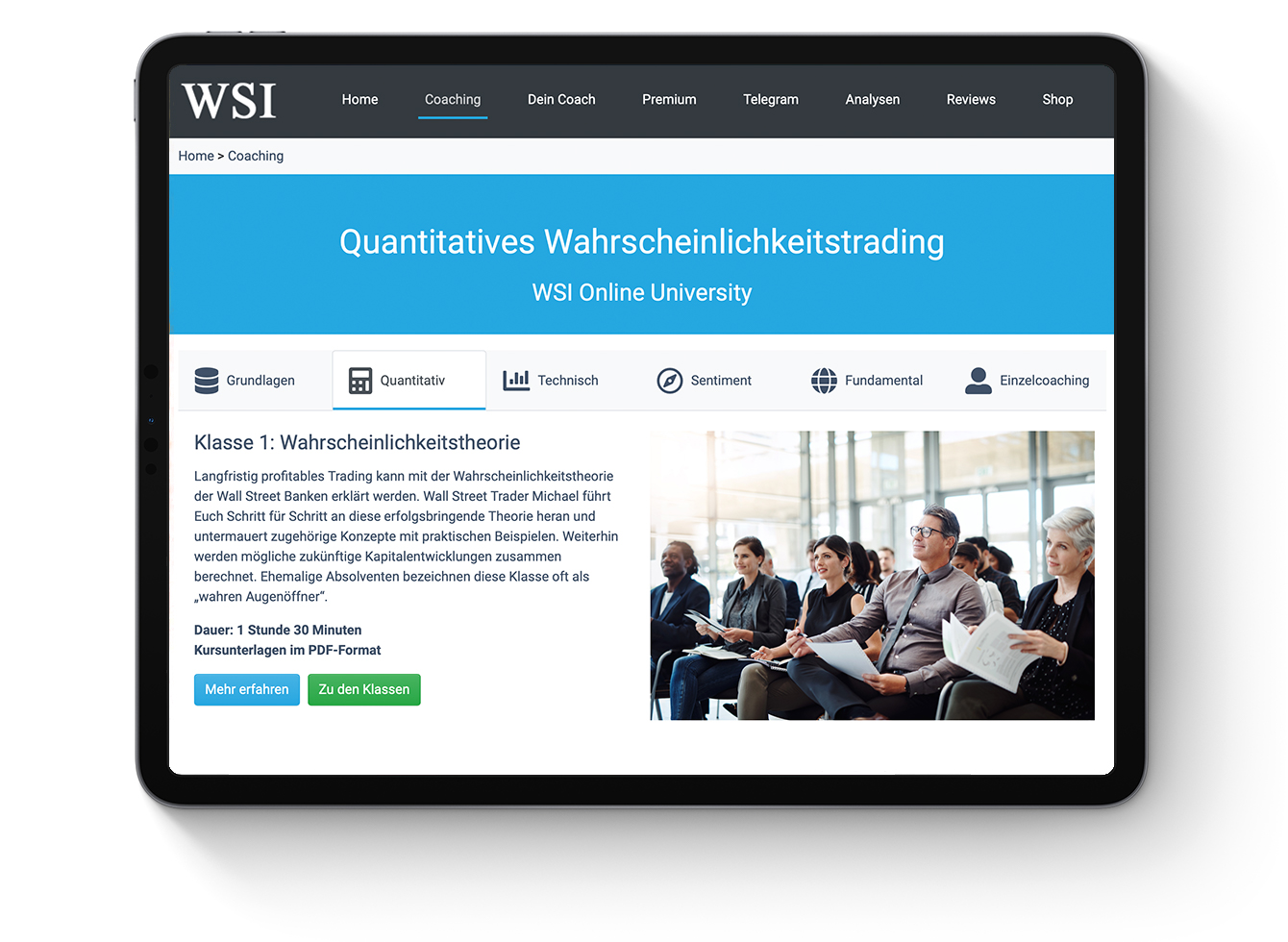 Langfristig profitables Trading kann mit der Wahrscheinlichkeitstheorie der Wall Street Banken erklärt werden. Wall Street Trader Michael führt Euch Schritt für Schritt an diese erfolgsbringende Theorie heran und untermauert zugehörige Konzepte mit praktischen Beispielen. Weiterhin werden mögliche zukünftige Kapitalentwicklungen zusammen berechnet. Ehemalige Absolventen bezeichnen diese Klasse oft als „wahren Augenöffner“.