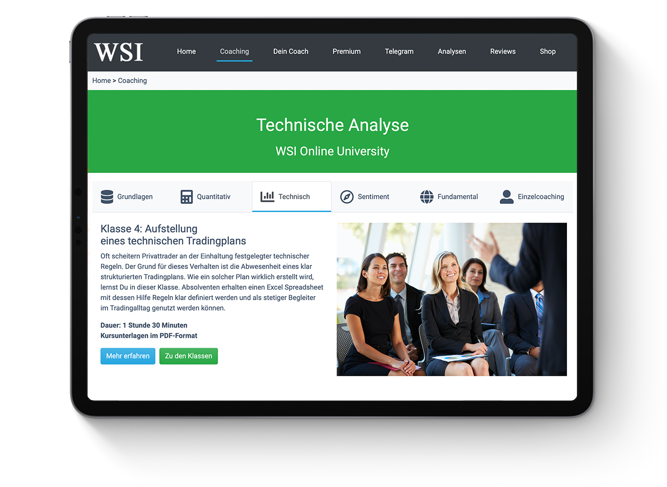 Oft scheitern Privattrader an der Einhaltung festgelegter technischer Regeln. Der Grund für dieses Verhalten ist die Abwesenheit eines klar strukturierten Tradingplans. Wie ein solcher Plan wirklich erstellt wird, lernst Du in dieser Klasse. Absolventen erhalten einen Excel Spreadsheet mit dessen Hilfe Regeln klar definiert werden und als stetiger Begleiter im Tradingalltag genutzt werden können.